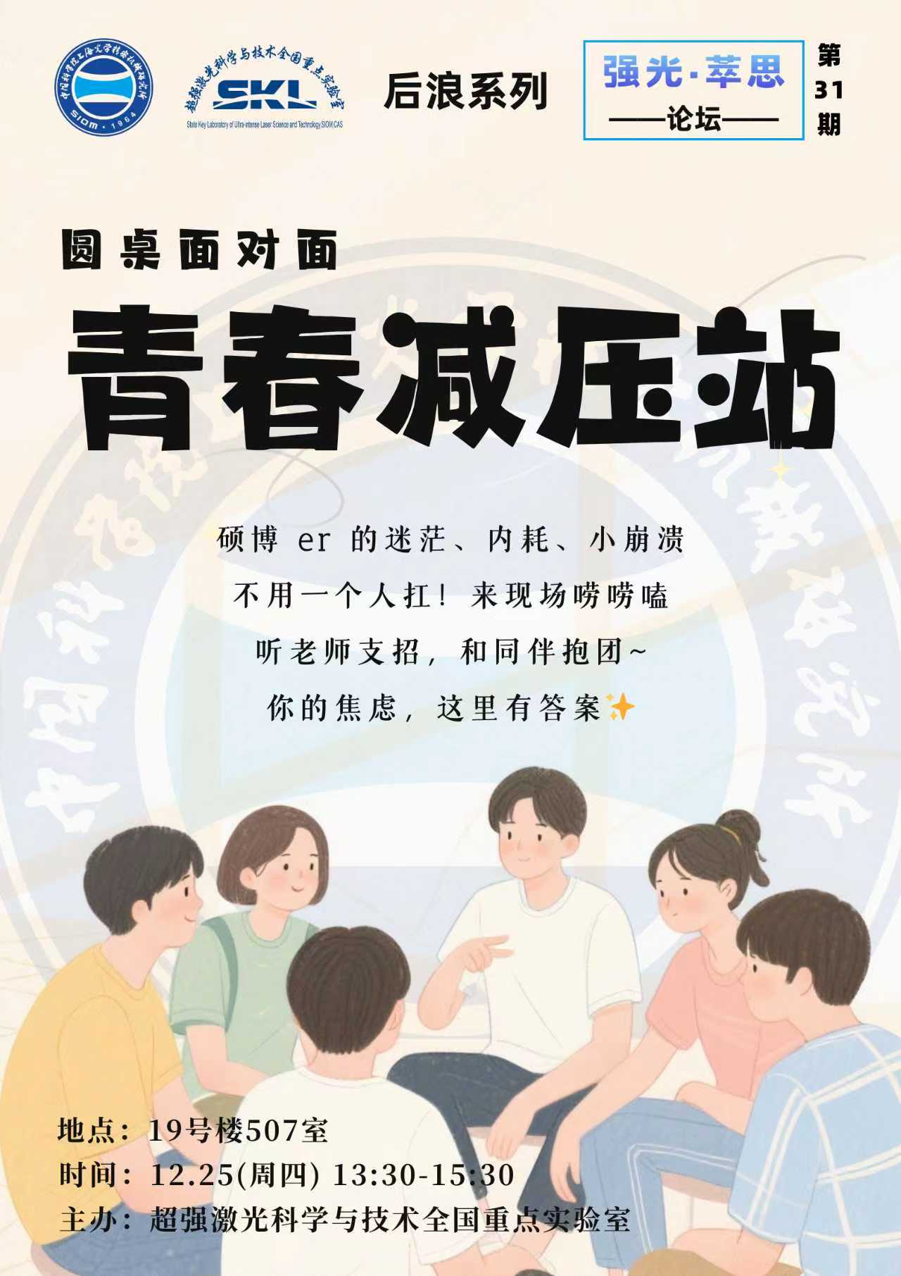 为全面落实立德树人根本任务,遵循学生成长规律,筑牢身心健康基石,并充分激发青年学子在科技攻关中的创新动能与攀登精神,超强激光科学与技术全国重点实验室(以下简称“全重”)于12月25日下午举办第31期“强光∙萃思”论坛。全重党总支副书记姚金平、行政秘书乔玲玲、导师代表李妍妍以及学生辅导员等出席活动。活动由新生田玉麟主持,约30名强光师生参会。