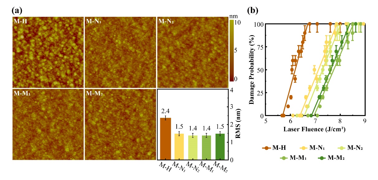 图1. 不同反射镜的(a)AFM显微图像及RMS粗糙度,(b)激光诱导损伤概率分布(8 ps,1053 nm)