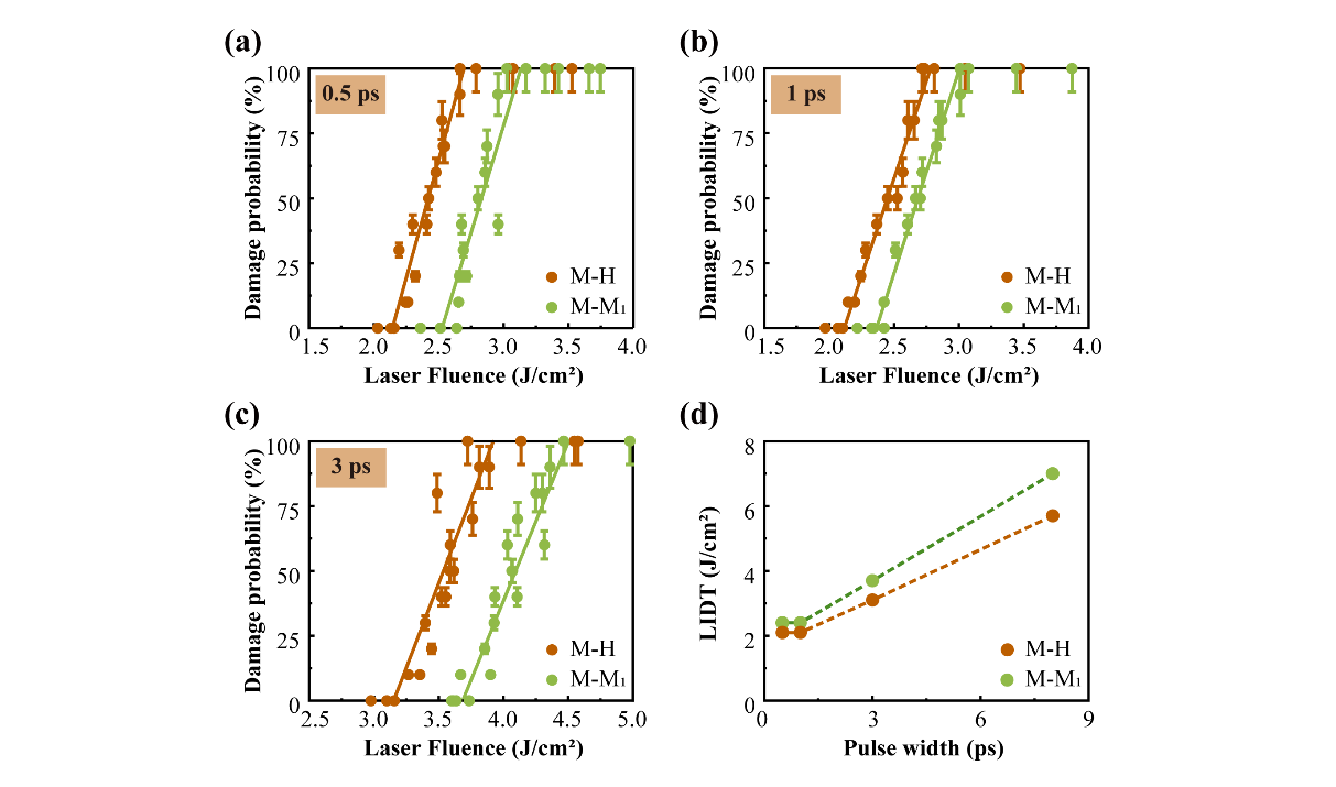 研究人员采用电子束蒸发技术制备了四种复合材料,包括氧化铪/氧化铝纳米叠层、氧化铪/氧化硅纳米叠层、氧化铪-氧化铝混合物和氧化铪-氧化硅混合物。与单一氧化铪材料相比,复合材料能够抑制结晶并降低表面粗糙度。采用上述复合材料和氧化硅材料作为高、低折射率材料,制备了四种工作波长位于1053 nm的反射镜。反射镜在不同脉宽(0.5 ps、1 ps、3 ps和8 ps)激光辐照下的损伤测试结果表明:与采用氧化铪作为高折射率材料的皮秒反射镜相比,采用复合材料作为高折射率材料的皮秒反射镜均表现出更高的激光损伤阈值。在本文研究的激光脉冲范围内,反射镜的初始激光损伤机制在3 ps附近开始发生变化。该成果对于提高皮秒激光反射镜等光学薄膜元件的性能具有重要意义。