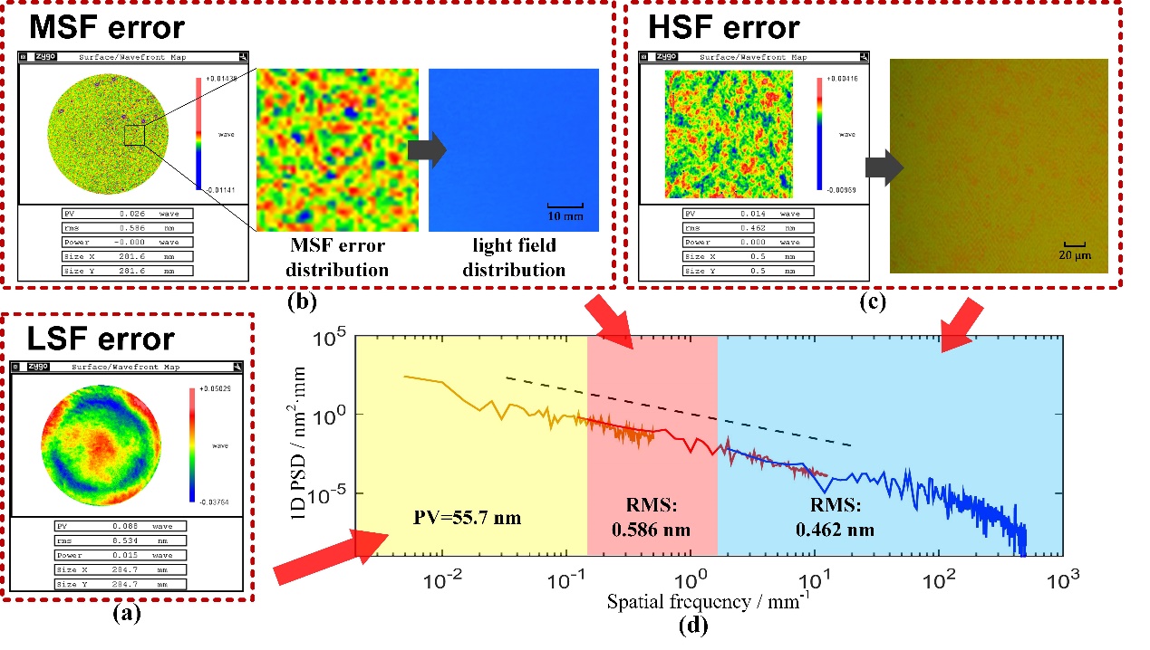 图1Φ300mm离轴抛物面镜曝光系统全频段误差结果:(a) 使用4英寸Zygo干涉仪测量离轴镜的低频面形误差。(b) 根据模型滤波后得到的中频误差和光场分布的图片;(c) 利用Zygo白光轮廓仪采用20倍镜头测量得到的高频误差以及显微镜测量的光栅掩模照片。(d) 1维功率谱密度曲线。