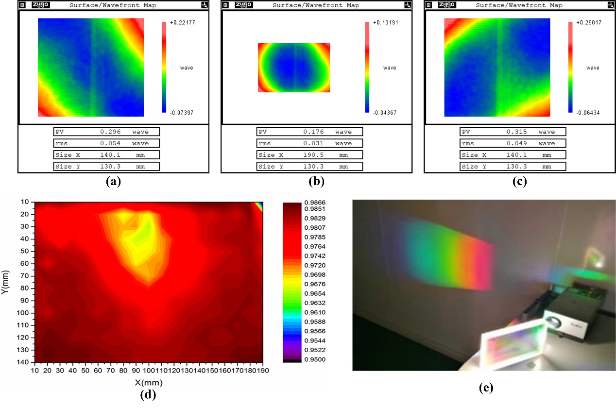 图2 200mm×150mm MLD光栅的衍射波前和效率分布:(a) -1级衍射波前。(b) 0级衍射波前。(c) +1级衍射波前。(d) 在1740 l/mm处的MLD光栅的衍射效率图,在1053 nm下有效孔径内衍射效率均匀(Ave = 98.1%,σ = 0.3%,Max = 98.6%)。(e) 采用反射曝光方法制作MLD光栅实物图。