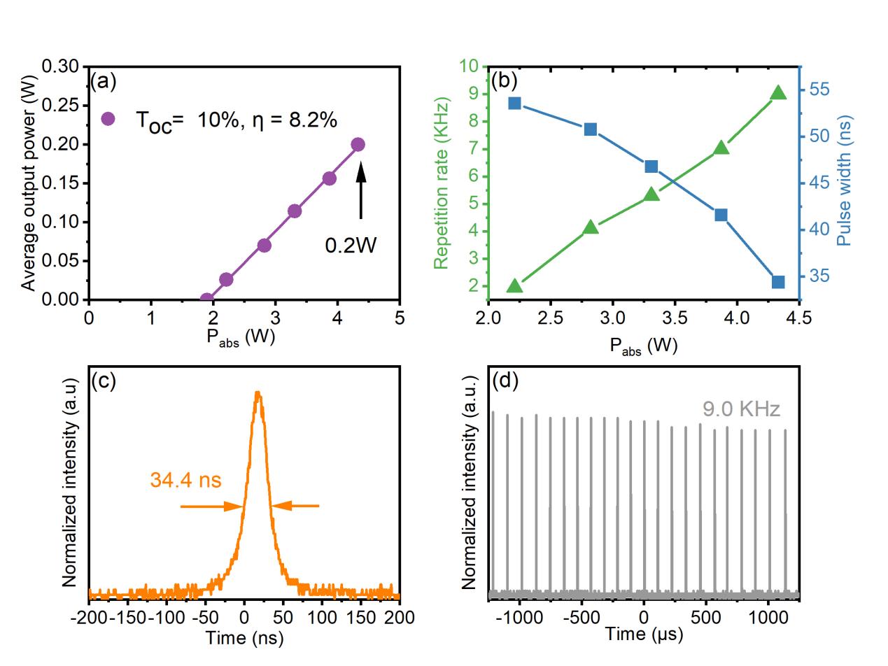 研究团队采用提拉法生长出0.93 at. %Nd:GSAG晶体,研究了其在1.3微米波段的激光性能。采用V型腔光路获得了斜率效率最高43.4%,最大功率2.01W的1336nm连续激光输出。利用Co:MgAl2O4晶体作为可饱和吸收体,获得平均功率0.2W,重复频率9.0KHz,脉宽34.4ns,峰值功率645W的被动调Q激光输出。实验结果表明,Nd:GSAG晶体能够提供高效1336nm的连续和脉冲激光输出,在光纤传输、医疗、航天、工业等领域具有应用前景。