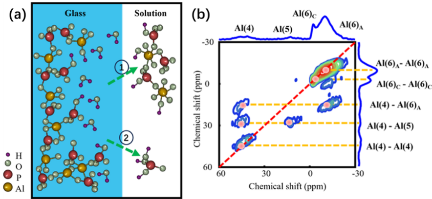 (a)玻璃的两种溶解模式。(b)腐蚀玻璃的27Al{27Al} 2D WURST 2Q-1Q谱