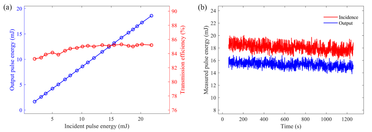 在本工作中,研究团队基于MM-AR-HCF,进行了多模高功率Nd:YAG纳秒脉冲激光的传输,成功实现了21.8 mJ脉冲能量,1.6 MW峰值功率的纳秒激光脉冲传输,耦合效率在93 %以上。并对激光脉冲传输前后的特性进行了表征,经9.8 m长的MM-AR-HCF传输后,激光脉冲光束质量明显改善,时域及光谱基本稳定。