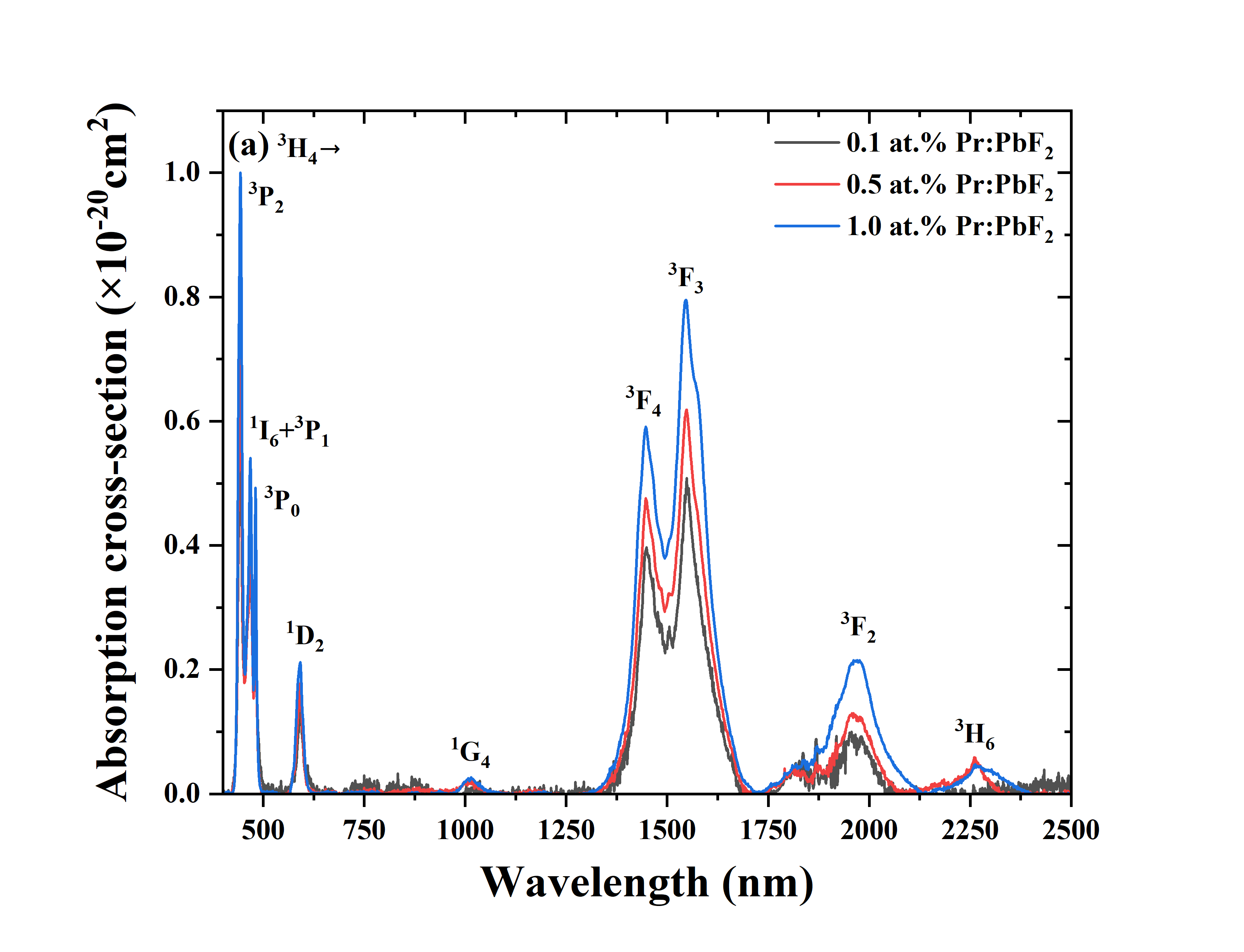 图1. 不同掺杂浓度Pr:PbF2晶体的吸收截面