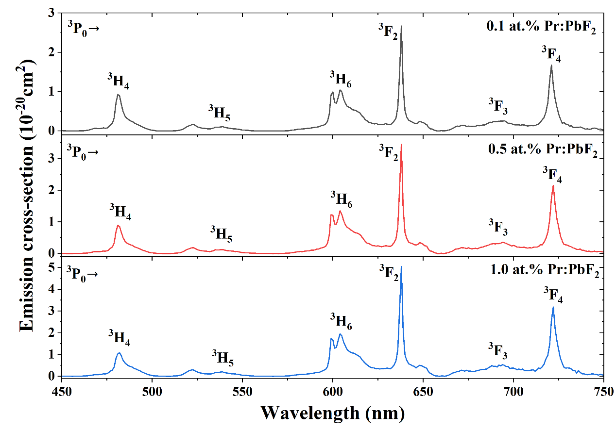 图2. 不同掺杂浓度Pr:PbF2晶体的发射截面