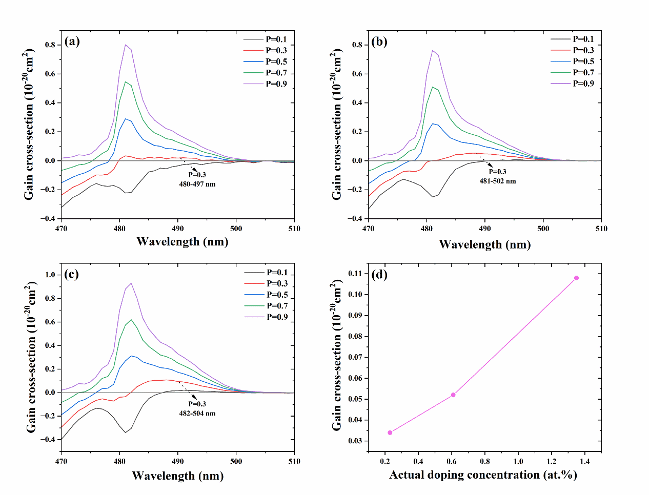 图3. 不同掺杂浓度Pr:PbF2晶体470nm-510nm范围内的增益截面以及最大增益截面与掺杂浓度的关系