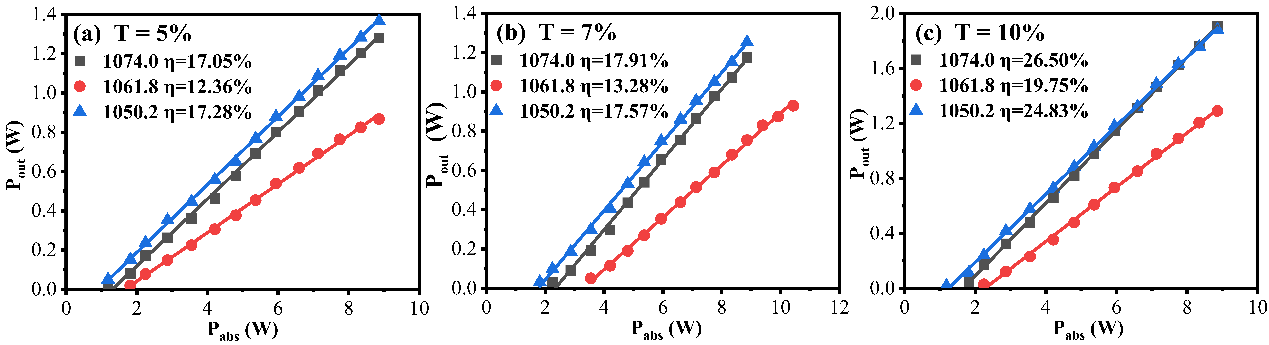 图2. 三个波长在不同输出镜透过率的激光输出