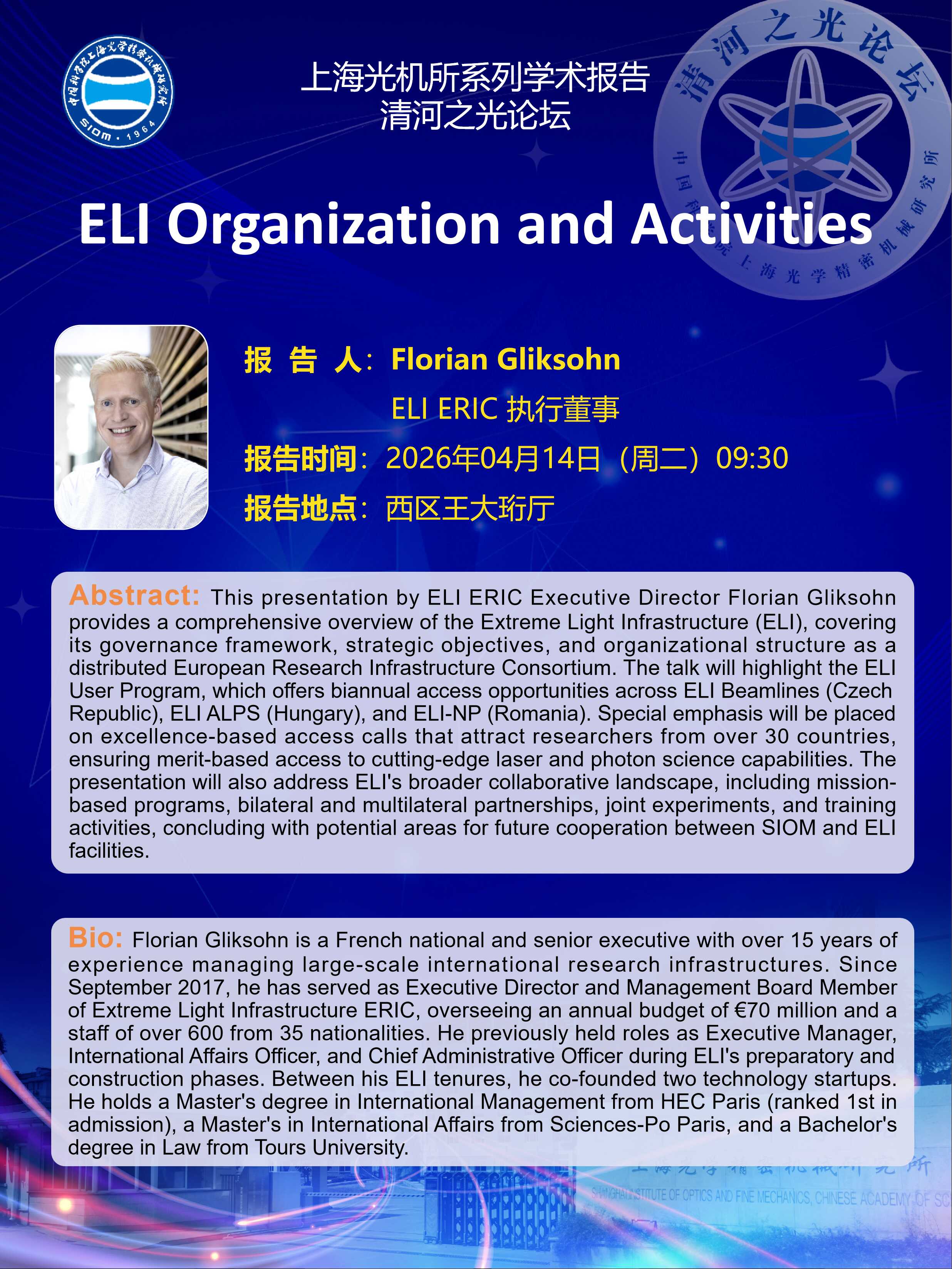 This presentation by ELI ERIC Executive Director Florian Gliksohn provides a comprehensive overview of the Extreme Light Infrastructure (ELI), covering its governance framework, strategic objectives, and organizational structure as a distributed European Research Infrastructure Consortium. The talk will highlight the ELI User Program, which offers biannual access opportunities across ELI Beamlines (Czech Republic), ELI ALPS (Hungary), and ELI-NP (Romania). Special emphasis will be placed on excellence-based access calls that attract researchers from over 30 countries, ensuring merit-based access to cutting-edge laser and photon science capabilities. The presentation will also address ELI's broader collaborative landscape, including mission-based programs, bilateral and multilateral partnerships, joint experiments, and training activities, concluding with potential areas for future cooperation between SIOM and ELI facilities. |