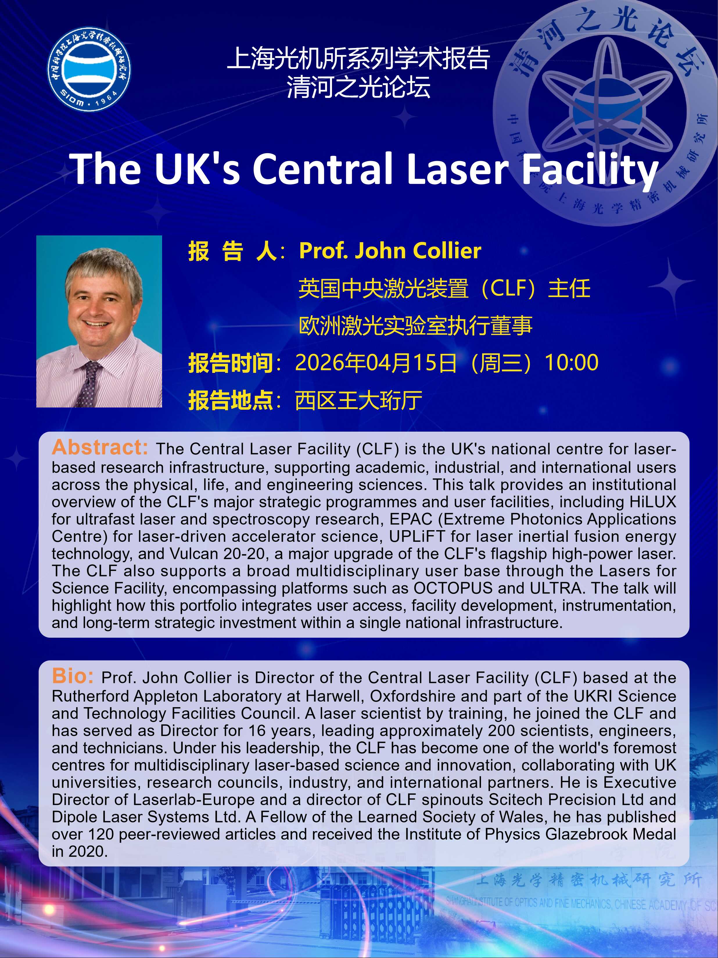 Prof. John Collier is Director of the Central Laser Facility (CLF) based at the Rutherford Appleton Laboratory at Harwell, Oxfordshire and part of the UKRI Science and Technology Facilities Council. A laser scientist by training, he joined the CLF and has served as Director for 16 years, leading approximately 200 scientists, engineers, and technicians. Under his leadership, the CLF has become one of the world's foremost centres for multidisciplinary laser-based science and innovation, collaborating with UK universities, research councils, industry, and international partners. He is Executive Director of Laserlab-Europe and a director of CLF spinouts Scitech Precision Ltd and Dipole Laser Systems Ltd. A Fellow of the Learned Society of Wales, he has published over 120 peer-reviewed articles and received the Institute of Physics Glazebrook Medal in 2020. |