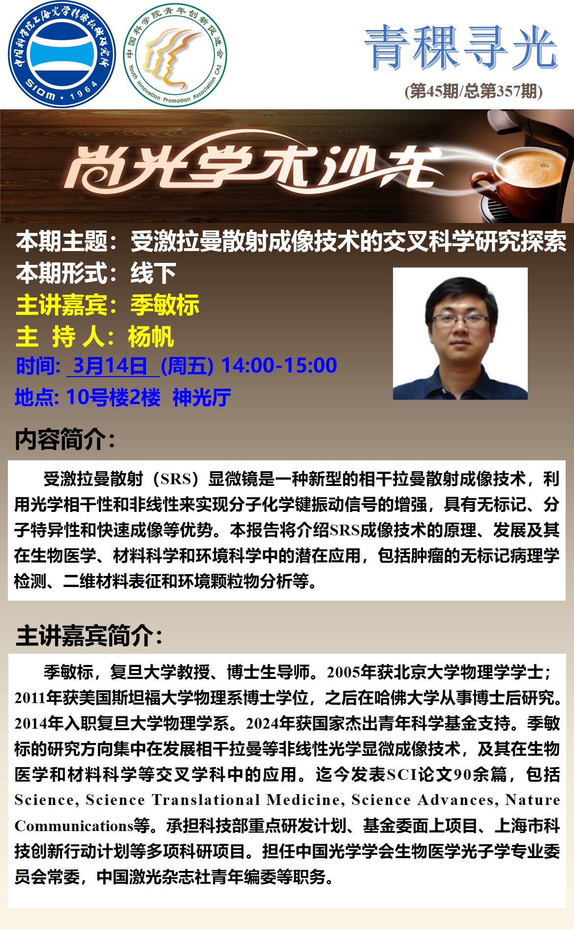 季敏标,复旦大学教授、博士生导师。2005年获北京大学物理学学士;2011年获美国斯坦福大学物理系博士学位,之后在哈佛大学从事博士后研究。2014年入职复旦大学物理学系。2024年获国家杰出青年科学基金支持。季敏标的研究方向集中在发展相干拉曼等非线性光学显微成像技术,及其在生物医学和材料科学等交叉学科中的应用。迄今发表SCI论文90余篇,包括Science, Science Translational Medicine, Science Advances, Nature Communications等。承担科技部重点研发计划、基金委面上项目、上海市科技创新行动计划等多项科研项目。担任中国光学学会生物医学光子学专业委员会常委,中国激光杂志社青年编委等职务。