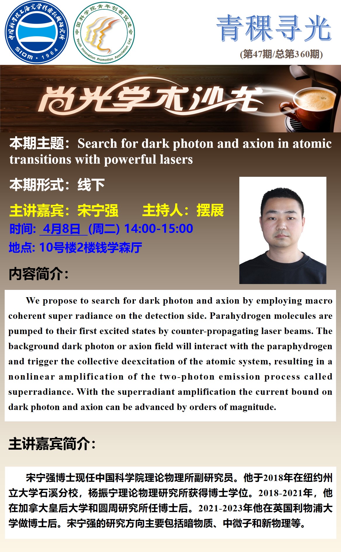 宋宁强博士现任中国科学院理论物理所副研究员。他于2018年在纽约州立大学石溪分校,杨振宁理论物理研究所获得博士学位。2018-2021年,他在加拿大皇后大学和圆周研究所任博士后。2021-2023年他在英国利物浦大学做博士后。宋宁强的研究方向主要包括暗物质、中微子和新物理等。