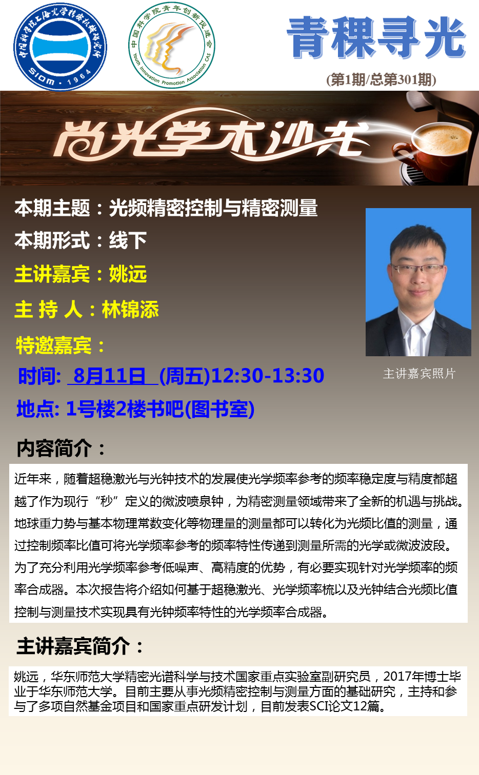 2023年8月11日12:30-13:30,上海光机所在线举办第1期/总第301期“青咖寻光•尚光学术沙龙”线下讲坛。本次讲坛邀请华东师范大学精密光谱科学与技术国家重点实验室姚远副研究员作学术报告。会议由上海光机所青促会会员林锦添主持,二楼图书馆座无虚席,部分师生还专门从北区到西区参加交流,近30名师生参加。