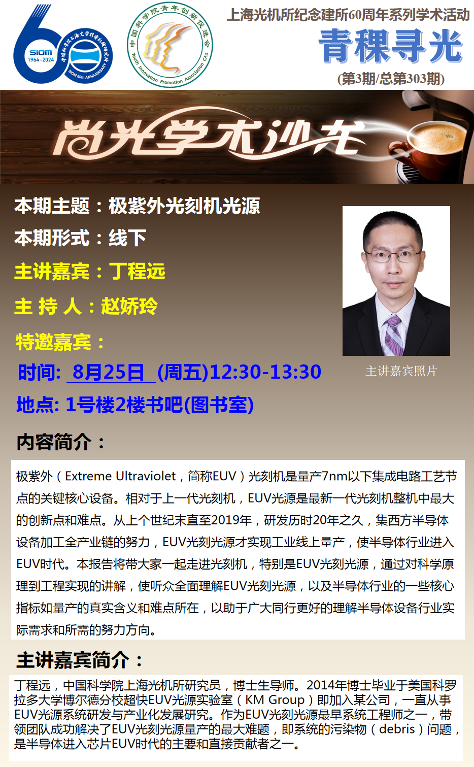 2023年8月25日12:30-13:30,上海光机所在线举办第3期/总第303期“青稞寻光•尚光学术沙龙”线下讲坛。本次讲坛邀请了极紫外(EUV)光刻光源最早系统工程师之一、中国科学院上海光机所研究员丁程远作学术报告。会议由上海光机所青促会会员赵娇玲主持,二楼图书馆座无虚席,40余名师生参加。