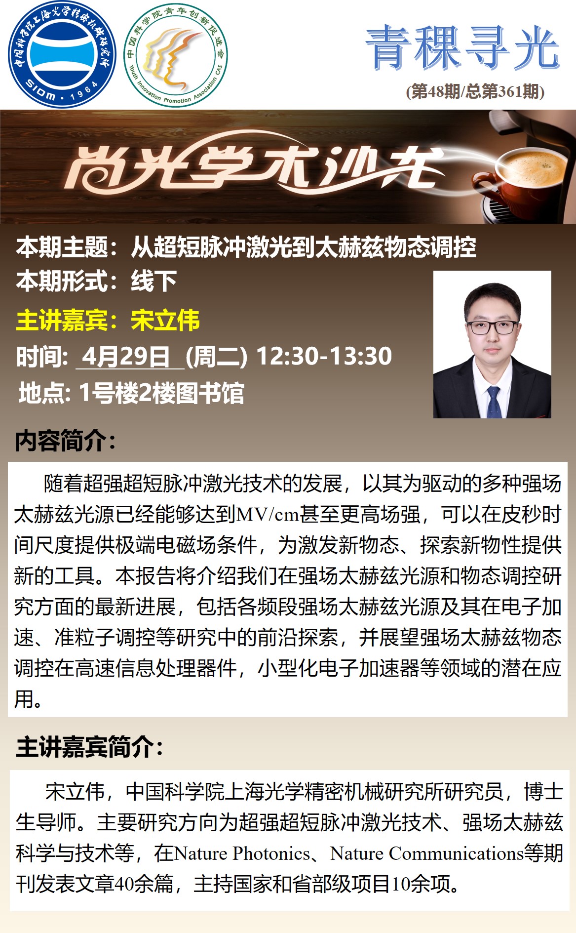 宋立伟,中国科学院上海光学精密机械研究所研究员,博士生导师。主要研究方向为超强超短脉冲激光技术、强场太赫兹科学与技术等,在Nature Photonics、Nature Communications等期刊发表文章40余篇,主持国家和省部级项目10余项。
