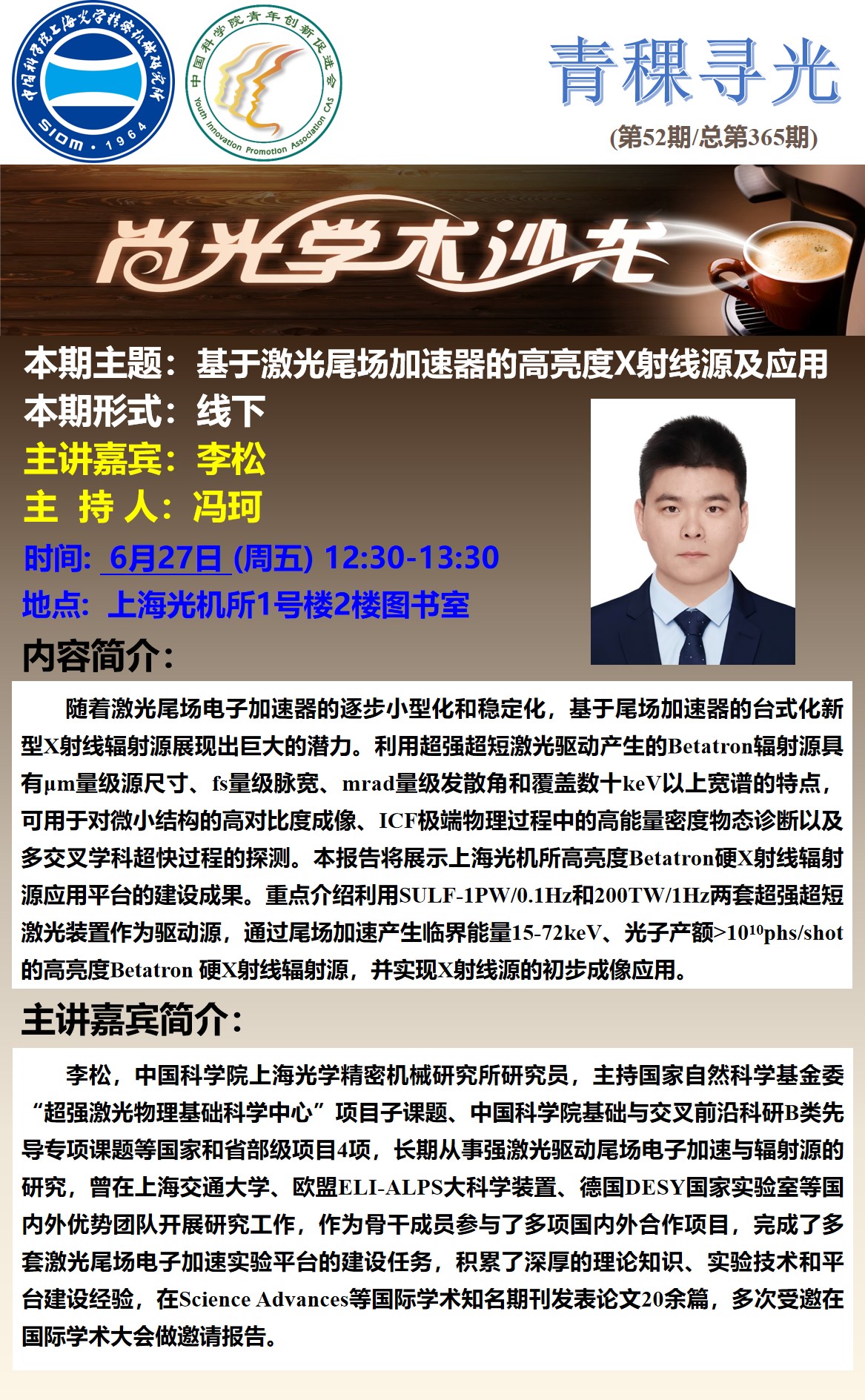 李松,中国科学院上海光学精密机械研究所研究员,主持国家自然科学基金委“超强激光物理基础科学中心”项目子课题、中国科学院基础与交叉前沿科研B类先导专项课题等国家和省部级项目4项,长期从事强激光驱动尾场电子加速与辐射源的研究,曾在上海交通大学、欧盟ELI-ALPS大科学装置、德国DESY国家实验室等国内外优势团队开展研究工作,作为骨干成员参与了多项国内外合作项目,完成了多套激光尾场电子加速实验平台的建设任务,积累了深厚的理论知识、实验技术和平台建设经验,在Science Advances等国际学术知名期刊发表论文20余篇,多次受邀在国际学术大会做邀请报告。