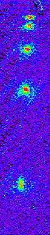 2003年在国家自然科学基金委和科技部的支持下成立了原子芯片组,承担自然科学基金重点课题“超冷原子和BEC物理性质研究”和“973”冷原子系综量子信息存储研究。该小组是由四位博士生和硕士生组成的青年研究组,他们一切从零开始,建立了我国第一套集光、机、电为一体的原子芯片实验装置,包括:超高真空系统、光学系统、激光稳频系统、外磁场系统、高分辩超冷原子成像系统和计算机程序控制系统等等。提出和设计了具有创新学术思想的H型静磁阱芯片和高频势阱芯片。与浙江大学物理系光学所合作,利用半导体微加工技术和我所的镀膜技术,成功地研制出国内第一块静磁阱原子芯片和高频势阱芯片。我们利用芯片曾进行了激光冷却气体原子、芯片表面蒸发冷却气体原子、磁光阱囚禁、原子波导和超冷原子团分裂等研究等。在此基础上开始了芯片BEC研究。实现BEC相变对实验条件的要求极为苛刻,我们优化了各个部件的设计和各个实验环节,并利用高频蒸发冷却技术,使超冷原子气体的温度冷却到300纳K,实现了BEC相变。凝聚体的原子数为3000个,与国际同类实验相同。右图给出了BEC相变的证据:当凝聚体从磁阱中下落时,在自由膨胀的过程中凝聚体的纵横比旋转900,这是相变的判据。