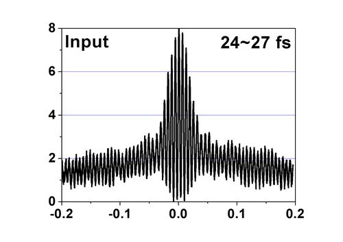 | 图1. 入射脉冲形状(脉宽约24fs~27fs) | 图2. 经过啁啾镜对反射后的脉冲宽度情况 |
