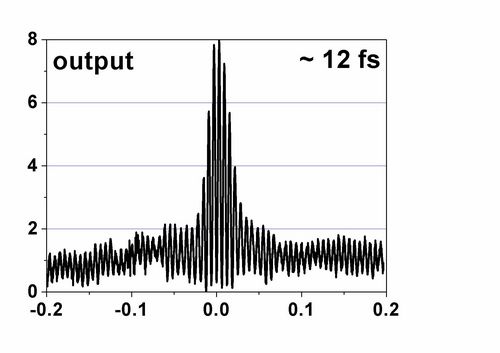 中科院强激光材料重点实验室针对800nm啁啾镜对的研制在原200nm带宽的基础上取得突破,设计和制备出550nm~1050nm超宽带啁啾镜对,在强场激光物理国家重点实验室进行腔外色散补偿实验,获得了12fs的脉冲压缩效果。这是国产超宽带啁啾镜对的首次应用。