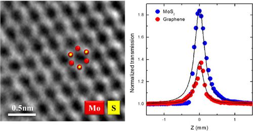 左图:二硫化钼的高分辨率透射电子显微图 ; 右图:二硫化钼和石墨烯分散液的Z扫描结果比较图