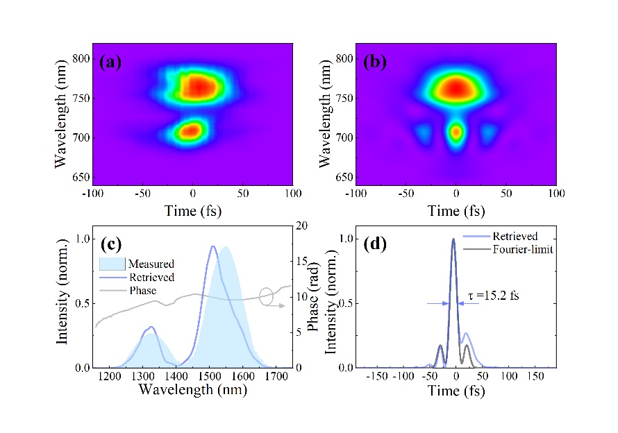 图1. 色散补偿后信号脉冲的SHG-FROG特性。(a)、(b) 测量和重建的FROG曲线。(c) 测量(浅蓝色阴影)和反演(蓝线)的光谱和相位(灰色线)。(d) 傅里叶极限脉宽(蓝色)和FROG反演脉宽(粉色)。