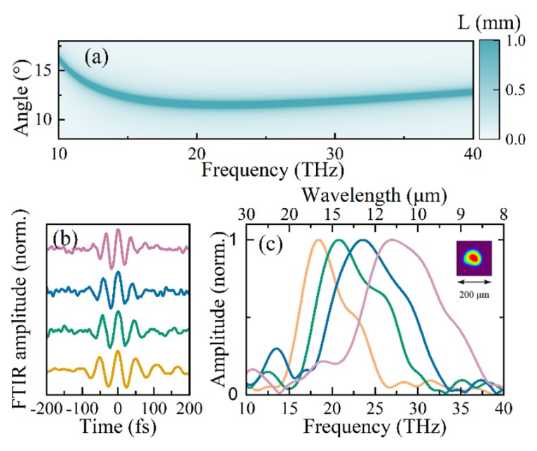 图2. OPA闲频脉冲的DFG。(a) 相位匹配角的计算;(b) FTIR光谱测量的干涉信号;(c) 可调谐太赫兹光谱和 27 THz输出时的焦点轮廓(插图)。