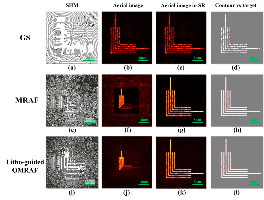 研究团队提出了基于光刻引导偏移混合区域振幅自由度(Litho-guided OMRAF)算法的合成全息掩模设计方法。将硅片平面上的光场划分为“信号区域”和“噪声区域”,通过减少噪声区域的约束,增强信号区域的收敛性和成像质量。考虑掩模制造约束条件,对掩模平面的振幅和相位进行有限级离散化处理。采用逐步离散化策略,防止迭代优化过程出现停滞,并有效避免算法陷入局部最优解。
