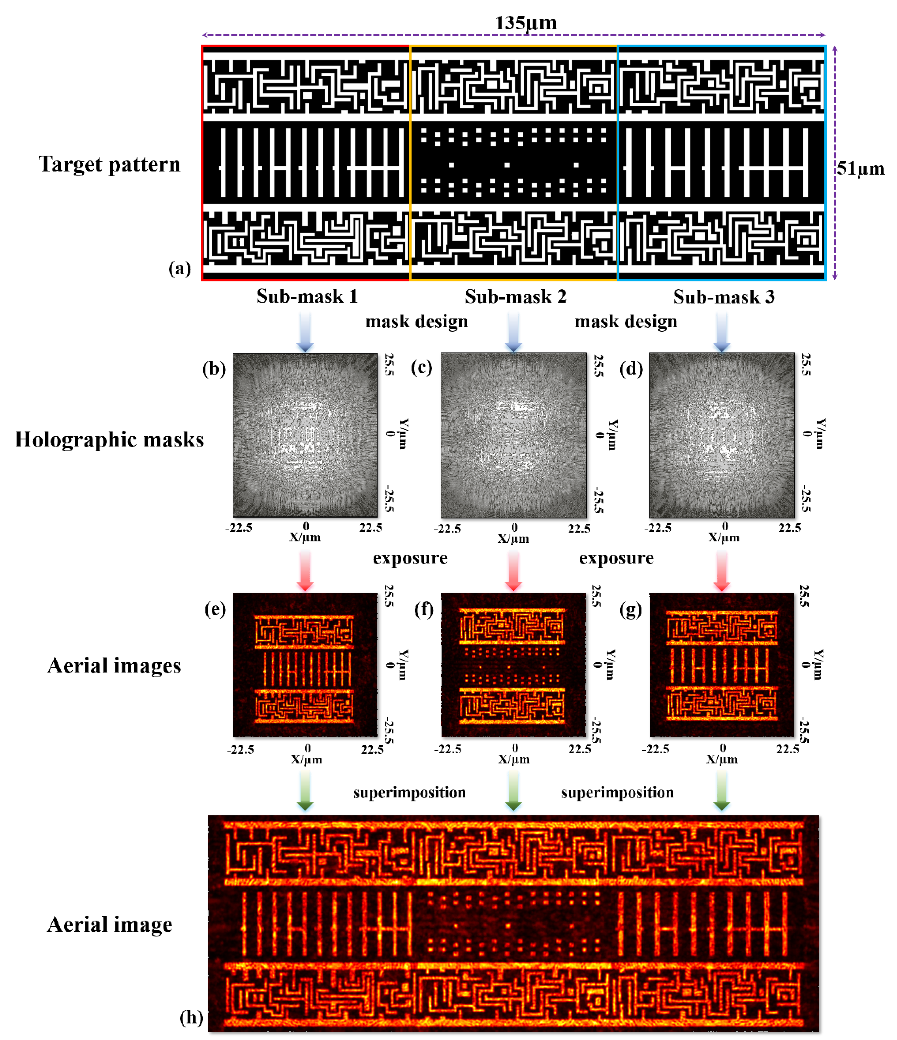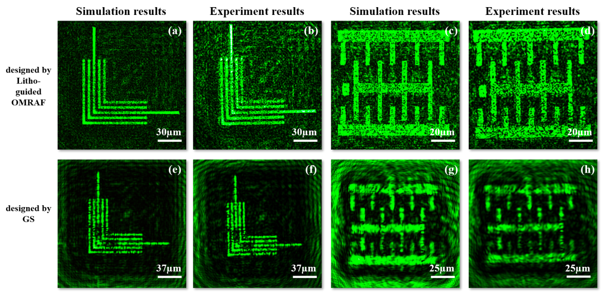 研究人员搭建实验系统进行了实验。图3展示了在相干照明条件下曝光不同掩模获得的实验结果。实验与仿真结果吻合。本方法设计得到的合成全息掩模的空间像,相比于GS方法具有更高的对比度和更锐利的线条边缘,能够更精确地重建目标图形分布。本研究探索了适用于小特征尺寸图形的全息掩模设计框架,有望为获得一种经济且高产能光刻方案提供一种潜在的技术手段。