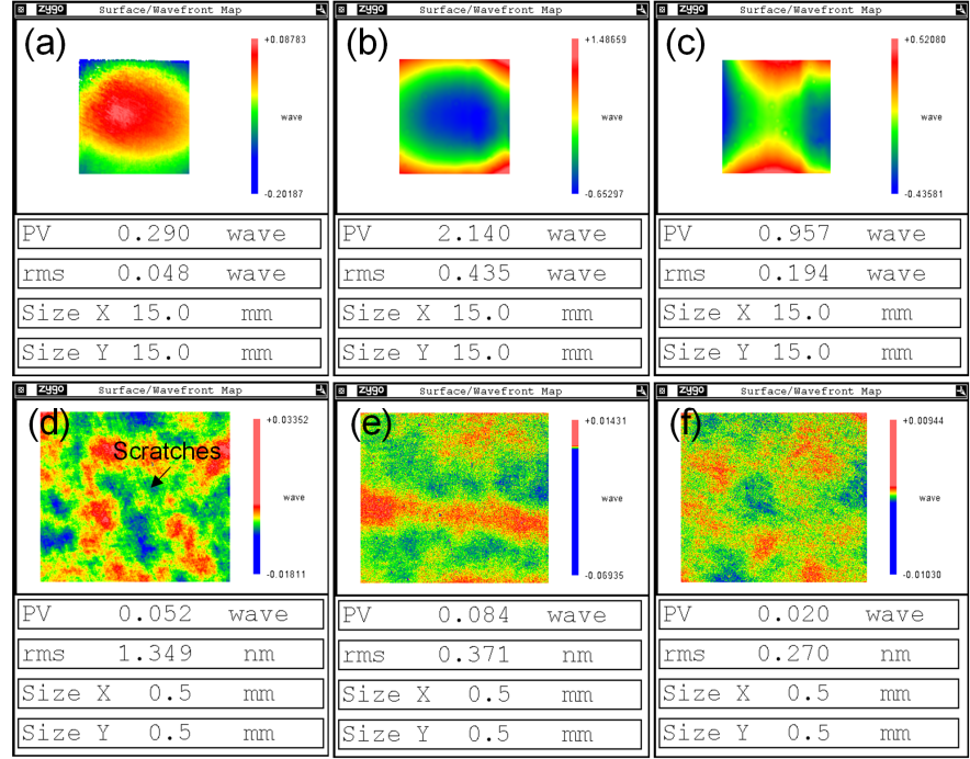 图3 面形结果:(a) 初始表面;(b) 激光单面抛光表面;(c) 激光双面抛光表面。粗糙度结果:(d) 初始表面;(e) 激光单面抛光表面;(f) 激光双面抛光表面。