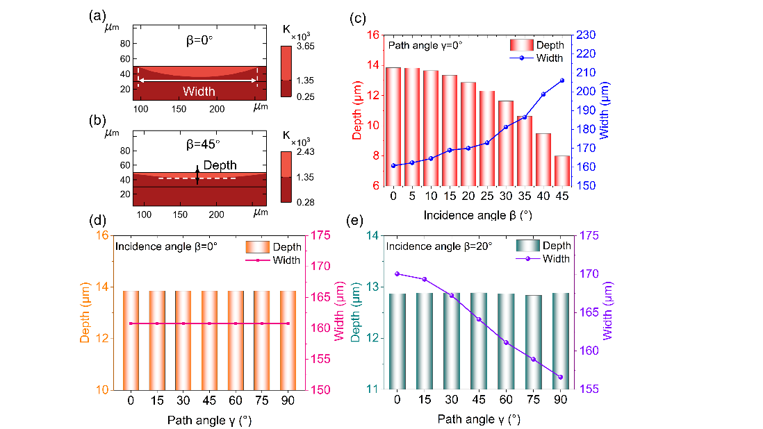 针对这一问题,该研究首次揭示了曲面元件对熔石英热力耦合效应的多尺度调控机制,建立了涵盖光斑畸变与吸收率动态衰减的普适模型,系统研究了脉冲CO₂激光烧蚀过程中入射角与路径角对熔石英表面形貌、温度、热影响区及残余应力的调控机制。本工作有助于深入了解激光烧蚀过程,为实现复杂曲面的高精度激光烧蚀奠定了理论基础,对光学元件超精密制造有重要意义。