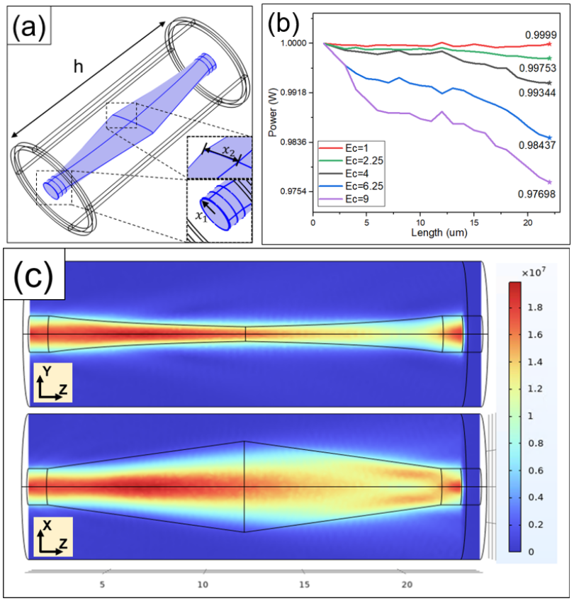图1 微气泡缺陷导致损耗的数值模拟。(a)变形纤芯的重建模型;(b)不同变形程度的纤芯的功率变化;(c)变形光纤的电场模。