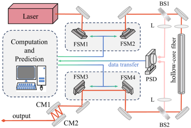 飞秒激光技术作为超快科学、精密制造和极端强场物理研究的关键工具,其指向稳定性是评估飞秒激光器性能的核心参数之一。环境振动、热漂移、空气扰动以及非线性效应等因素会引起指向抖动,飞秒激光在空芯光纤(Hollow-Core Fiber, HCF)等非线性系统中,由于传输过程中经历如自相位调制、自聚焦等非线性效应,使得输入与输出之间呈现高度非线性关系,传统的机械稳定系统或线性反馈机制往往难以有效应对。