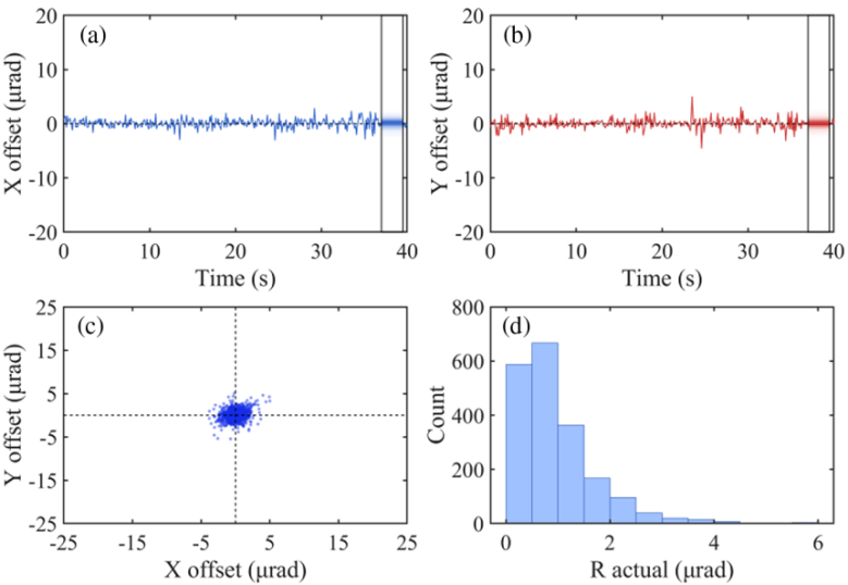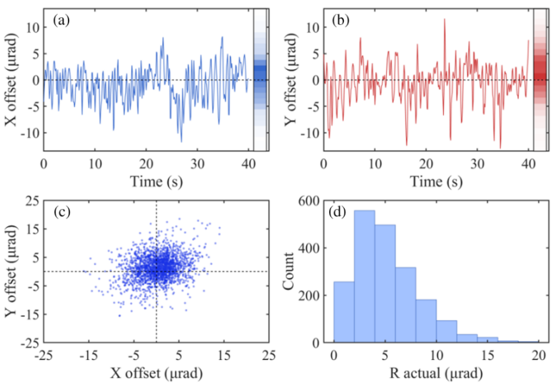 图3 经校正的水平(a)和竖直(b)指向稳定性。(c)指向抖动分布示意图,(d)中心点统计示意图。