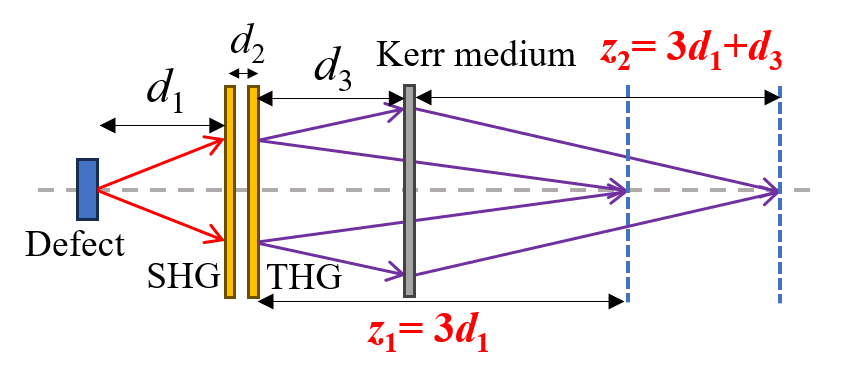 已有研究表明,上游缺陷会在自聚焦介质下游的共轭面产生一个热像,而在多块介质级联的条件下,甚至出现复杂多峰热像现象。热像的强度可达平均光强的数倍,是限制高功率激光器输出能力的一个关键因素。热像相关规律是整个驱动器设计的重要依据,而终端光学系统中自聚焦和非线性频率变换过程共同作用下的热像演变规律还尚未明确。