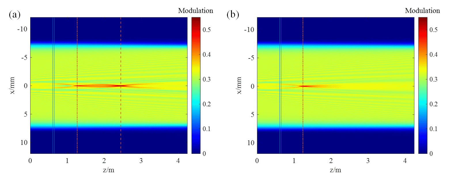 图2. 晶体下游横向光场随传输距离的演变,红色虚线代表热像面的位置。(a)级联作用;(b)单独考虑频率转换过程。
