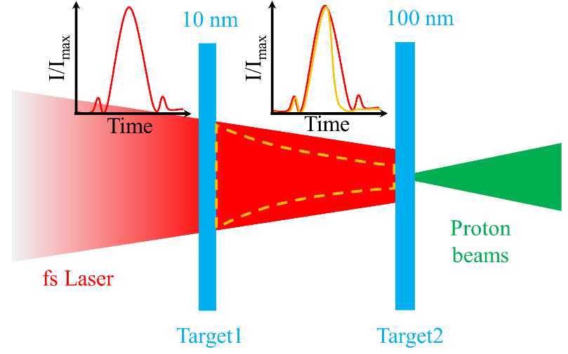 针对这一问题,研究团队提出一种新型双层纳米薄膜靶结构设计方案,可显著提升激光驱动质子加速的能量输出。该结构由两层纳米厚度薄膜组成,其物理机制在于:激光脉冲在通过第一层纳米靶时,由于自聚焦效应的存在导致激光脉冲光强显著增强;同时,自相位调制效应的产生使脉冲前沿变得更为陡峭。这种经过时空整形的激光脉冲非常有益于辐射压加速的产生,从而在与第二层纳米靶相互作用时实现了更高能量的质子加速。实验结果表明,相较于传统的单层靶,该双层纳米薄膜靶可将质子束能量提升2.7倍,同时加速产生的质子总数增加了近6倍。这一重要发现为优化激光驱动离子加速提供了新的思路,同时证实了发展高性能激光质子源可行性。