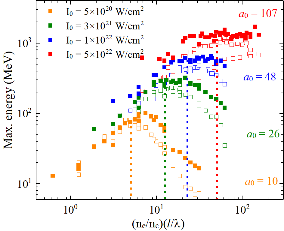 图2 不同激光强度条件下双层靶(实心方格)和单层靶(空心方格)的最大质子能量与等离子体参数的关系