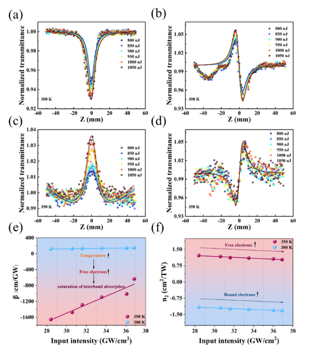 图1. VO₂薄膜在(a, b)300 K和(c, d)350 K下的z扫描测试结果。其中,左列为开孔(OA)测试数据,右列为闭孔(CA)测试数据。不同温度下,(e)非线性吸收系数β和(f)非线性折射率n₂的功率依赖性。