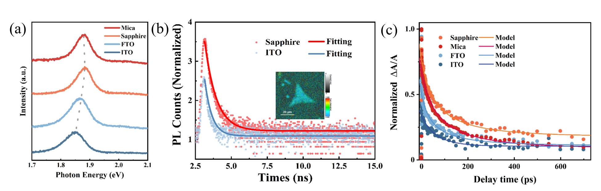 图1单层MoS2在不同衬底上的 (a) 荧光特性, (b) 荧光寿命成像实验结果和 (c) 瞬态吸收实验与模型结果