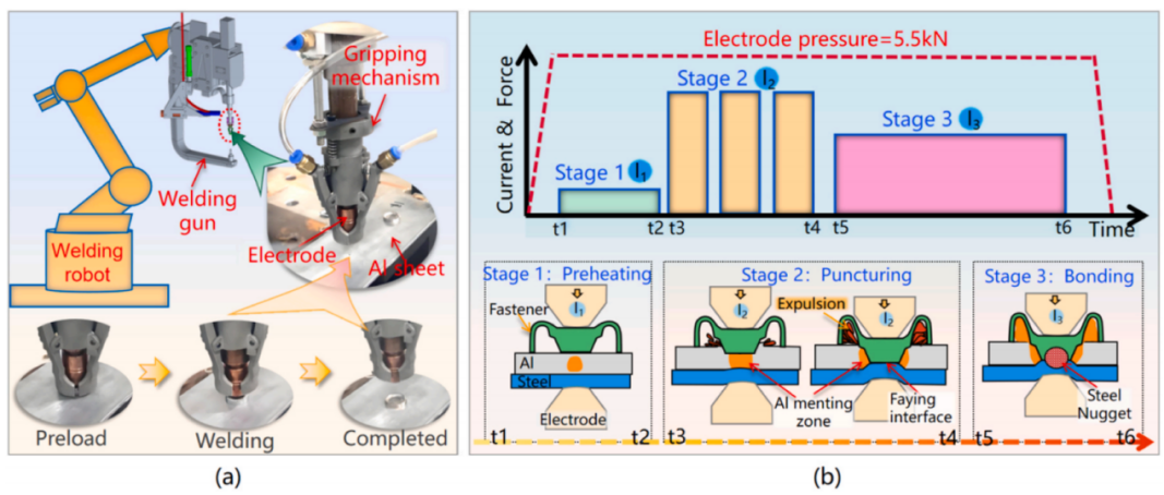 针对上述挑战,本研究基于团队开发的“主动诱导铝飞溅激励紧固件穿刺技术”,以功能需求和焊点成型特性为导向,创新设计和发明了一种新型紧固件结构(具体焊接装置及工艺示意图见图1),最终形成高强度焊点。结合高速摄影与显微分析技术,深入研究了高电流飞溅脉冲在排铝与穿刺过程中的作用机制。结果表明:瞬时输入的飞溅脉冲选择性地熔化焊点区域的铝合金,在熔融铝自身膨胀与电极压力的协同作用下,促成了液态铝的受控高速排出。这种主动诱导界面铝材快速排出的方式,使电极得以驱动紧固件高速穿透铝层,与钢工件建立无残留铝的洁净接触界面。该排铝与穿刺策略,为在紧固件与钢之间形成免受脆性相危害的连接奠定了关键基础,从而实现了铸铝/超高强钢异种金属的高强度连接。本工作为铝/钢等异质材料连接提供了一种创新工艺与方法,具有重要的工业应用价值。
