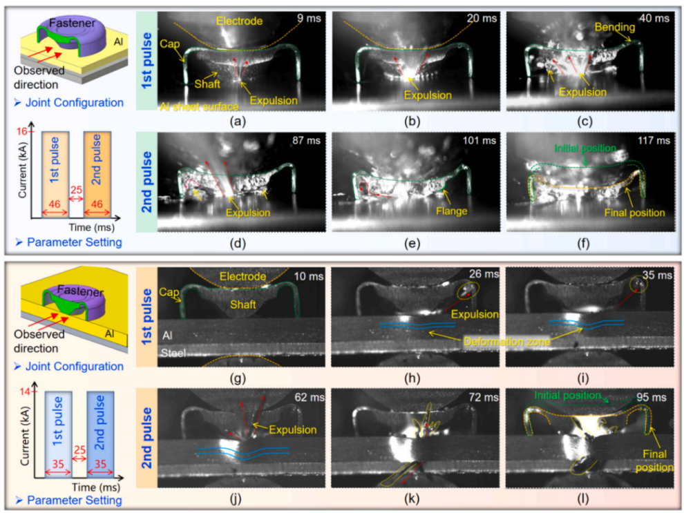 图2 .高速摄影拍摄的紧固件轴部穿刺铝板过程:(a-c)和(d-f)分别显示了第一和第二飞溅脉冲作用下的焊接点表面形貌;(g-i)和(j-l)分别展示了与第一和第二飞溅脉冲作用下的焊接点横截面形貌。