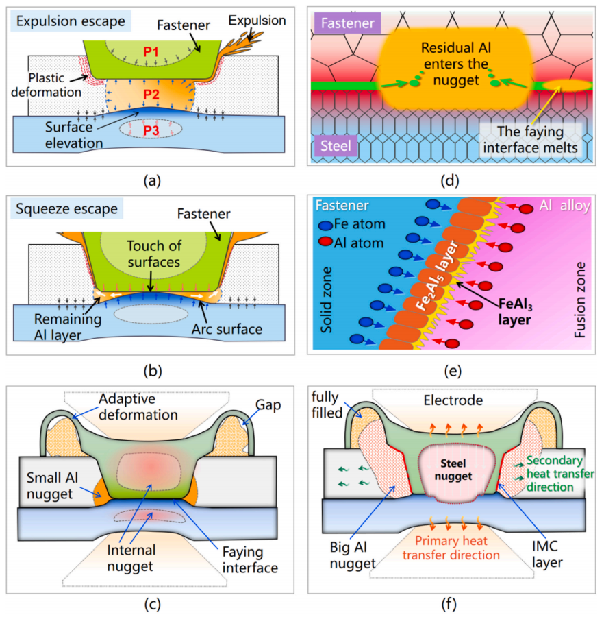 图3 液态铝排出、轴部穿透动力学及焊缝形成的多阶段成型机制示意图:(a)双向压缩作用下的铝定向排出;(b)轴端部与弧形钢表面的渐进接触过程;(c)轴部与钢的界面特征;(d)轴部与钢接触区域的界面熔化;(e)熔融铝与轴侧表面之间的冶金反应;(f)最终焊缝形态及其热传递路径。