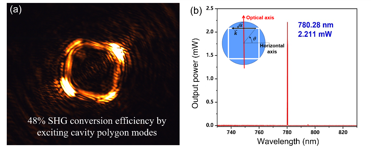 在高效二次谐波产生方面,团队设计了色散合理的X切薄膜铌酸锂微盘腔,结合飞秒激光光刻辅助的化学机械抛光技术,成功制备了高品质因子的圆对称微盘腔。通过锥形光纤与微盘腔的上表面边缘直接接触耦合引入弱微扰,诱导近简并模式发生重组,形成了本征品质因子高至3.86x107的正方形模式。该模式具有两条平行边垂直于晶体晶轴的特定取向特征,在不引入精细的周期性极化工程的前提下,实现了对非线性系数d33的有效利用,并获得~80%的模场重叠积分。实验采用水平偏振的1561 nm连续光泵浦该正方形模式,激发了与微腔其他正方形模式共振的二次谐波,在4.6 mW泵浦功率下获得了绝对转换效率达到48%的高效频率转换,验证了该微腔结构在高效频率转换方面的良好性能。