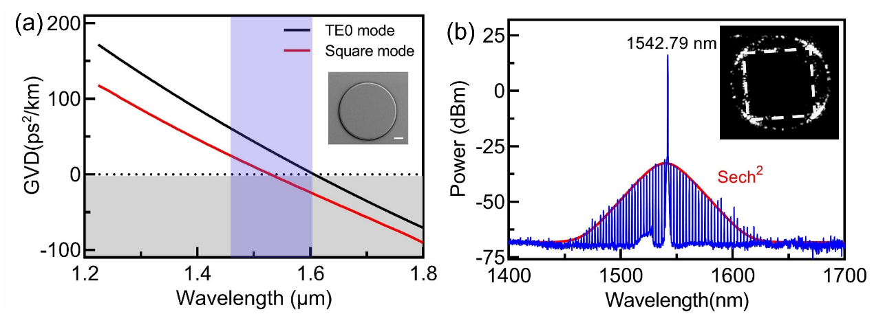 图2 基于薄膜铌酸锂微腔正方形模式的低阈值孤子微梳产生。(a)基模和正方形模式的色散,插图:微盘腔的扫描电镜图,标尺20µm。(b)孤子微梳的光谱,插图:孤子微梳产生时微腔的光学显微图。