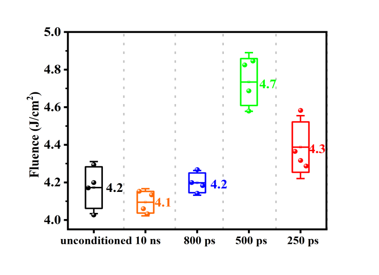 基于多层介质膜的终端反射镜及脉冲压缩光栅的皮秒抗激光损伤能力限制着高能皮秒拍瓦激光系统的最终输出能力,然而通过进一步优化制备工艺来提高多层介质膜皮秒抗激光损伤能力仍面临显著挑战。鉴于现阶段多层介质膜制备工艺优化的困境,考虑快点火应用对多层介质膜~10ps工作脉宽的需求,团队提出利用激光预处理技术调控诱导皮秒激光损伤的纳米缺陷的思路,并优化激光预处理工艺参数,实现了多层介质膜皮秒抗激光损伤能力的有效提升。