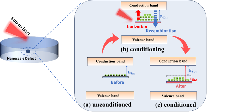 团队分别采用10 ns、800 ps、500 ps 和 250 ps脉宽激光对多层介质膜进行处理,发现500 ps激光预处理对多层介质膜在~10 ps激光辐照下的激光损伤阈值(LIDT)提升~12%,但其他脉宽预处理的多层介质膜LIDT 变化不明显。分析表明500 ps 激光预处理所产生适宜的晶格温度,调控优化了缺陷能级,进而降低了缺陷初始自由电子在后续~10ps激光辐照下的迁移概率,最终提升了其皮秒LIDT。团队还进一步验证了500 ps 激光预处理多层介质膜在1-20 ps脉宽范围的抗激光损伤能力,结果表明其LIDT提升效果随脉宽增加而增强,这进一步证实了激光预处理调控的对象主要是对皮秒损伤敏感的局域纳米缺陷。该研究为光学元件皮秒抗激光损伤能力提升技术及缺陷调控机制研究提供新参考。