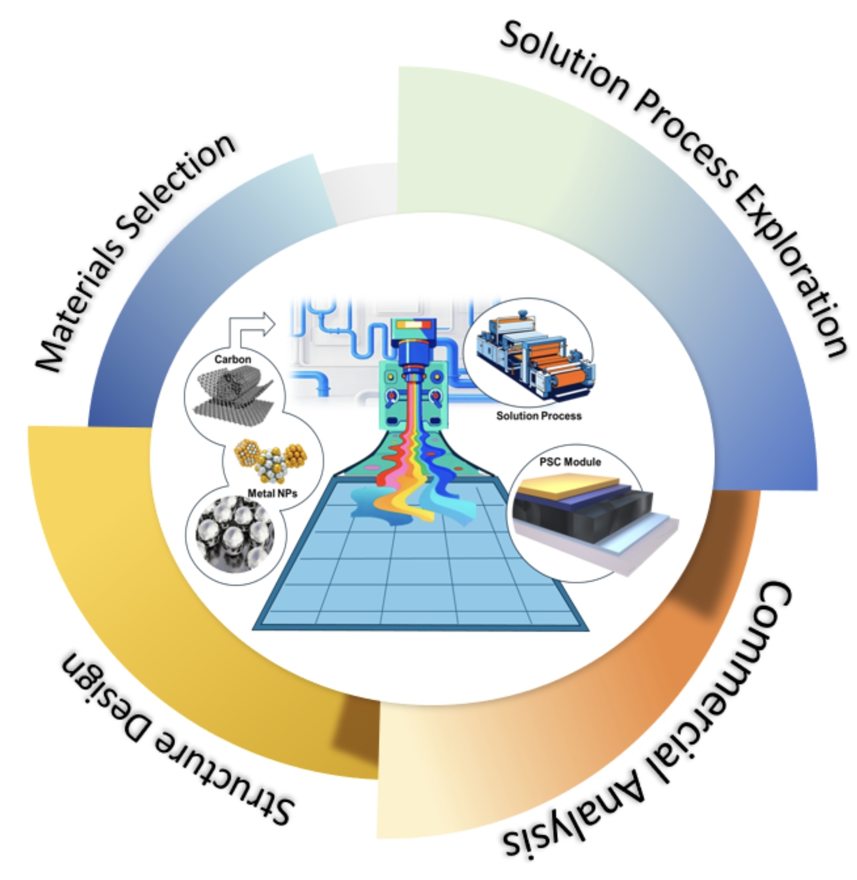 PSCs因其高效率和低成本潜力,在光伏产业中展现出巨大应用前景,被视为下一代光伏技术的有力竞争者。然而,要实现 PSCs 的大规模商业化应用,仍需解决包括顶电极优化在内的诸多关键挑战。传统真空蒸发法制备顶电极虽能获得高质量电极,但存在设备成本高、工艺复杂、材料选择受限以及高温操作可能影响钙钛矿层稳定性等问题。相比之下,溶液加工技术具有操作简便、成本低、可大面积制备、适用于多种基底以及与柔性基底兼容等显著优势,为 PSCs 顶电极制备提供了极具潜力的替代方案。