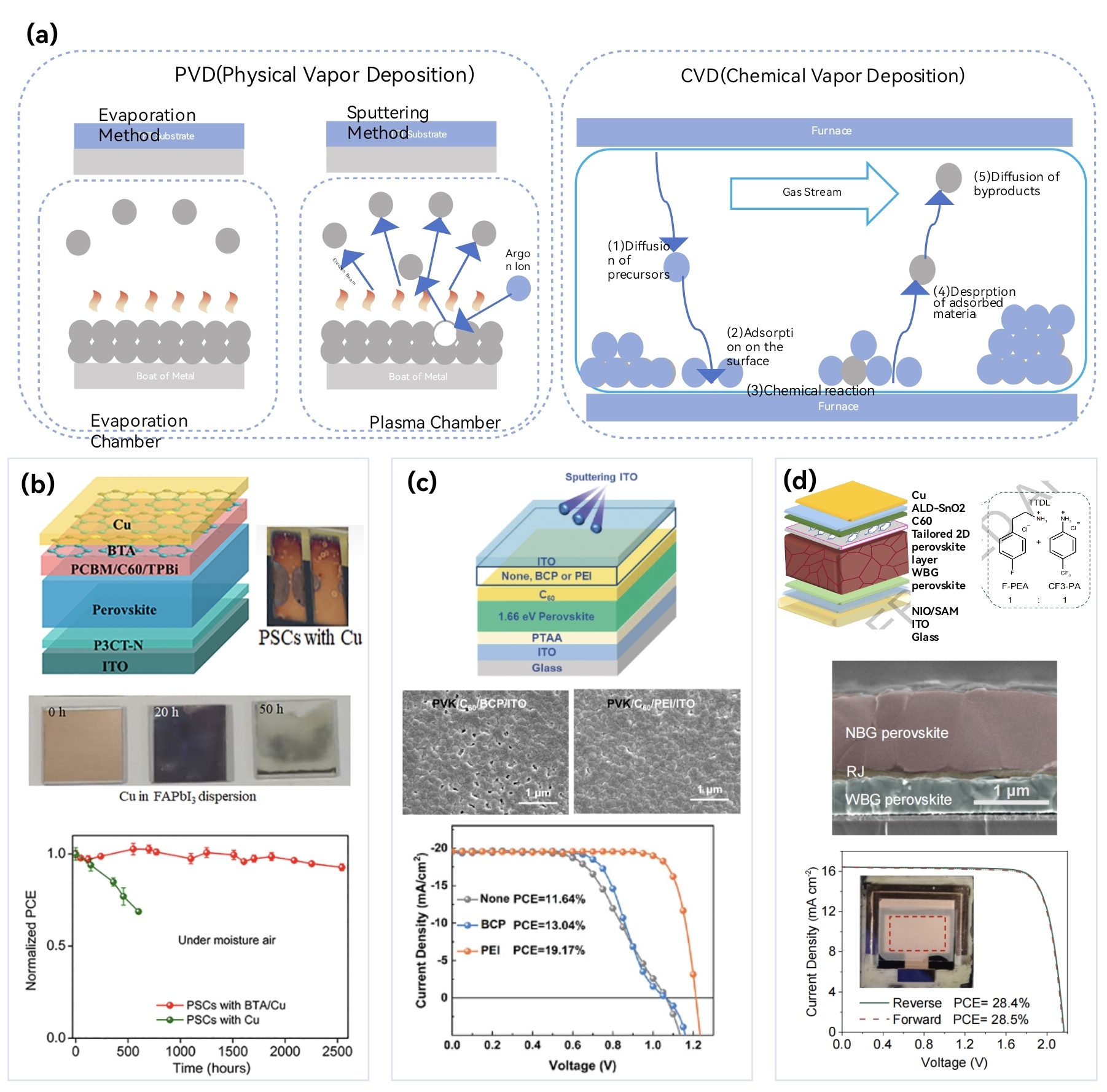 图2 . (a)物理气相沉积(PVD)和化学气相沉积(CVD)原理流程示意图;(b)BTA 防腐装置的配置图和原理流程图。(c)具有三种不同透明电极的 PSCs 的 J-V 曲线图。 (d)宽禁带器件的原理图以及截面SEM,冠军串联器件的 J-V曲线。