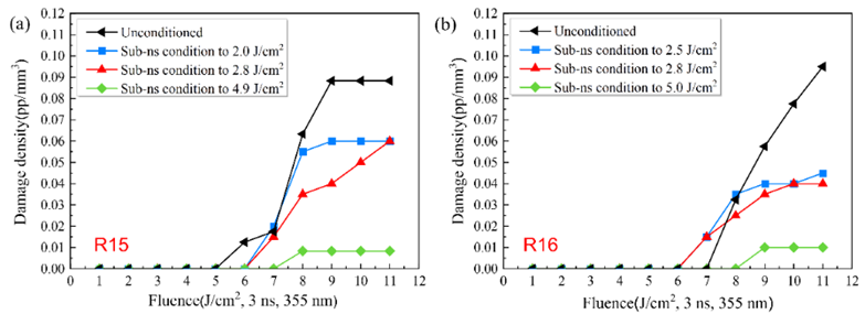 图1. 不同亚纳秒激光预处理工艺后DKDP晶体的纳秒损伤密度曲线
