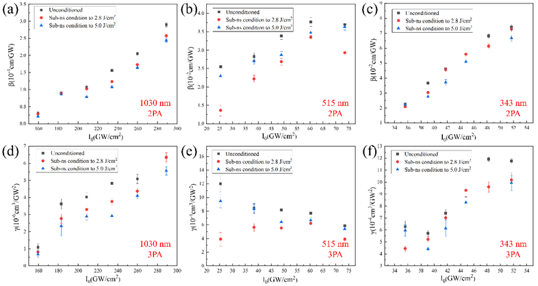 图2 (a, d)1030 nm(b, e)515 nm(c, f)343 nm 激光辐照下DKDP晶体的2PA和3PA非线性吸收系数